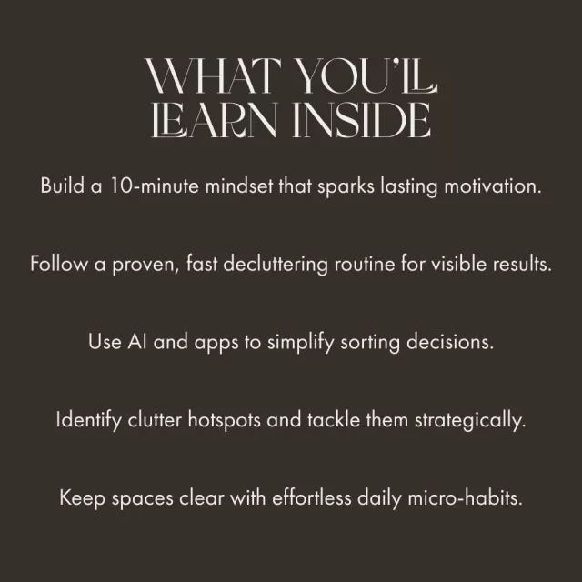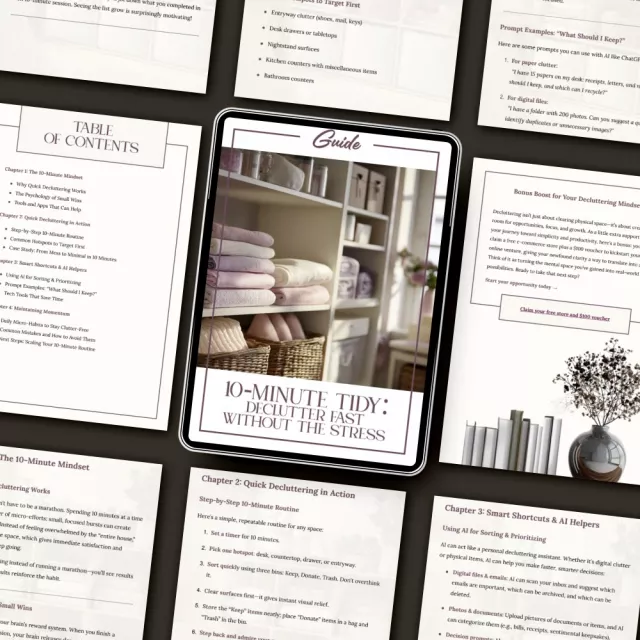 • Chapter 1: The 10-Minute Mindset — Discover why quick decluttering works, the psychology of small wins, and the best tools and apps to make it effortless.