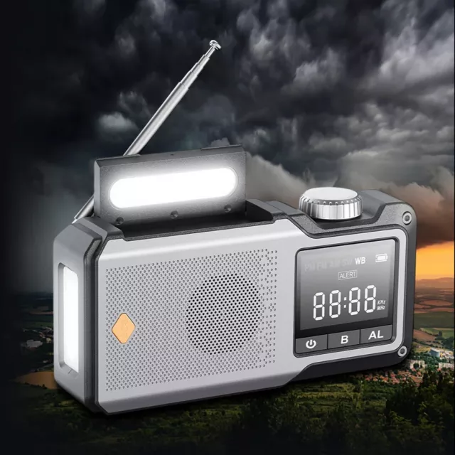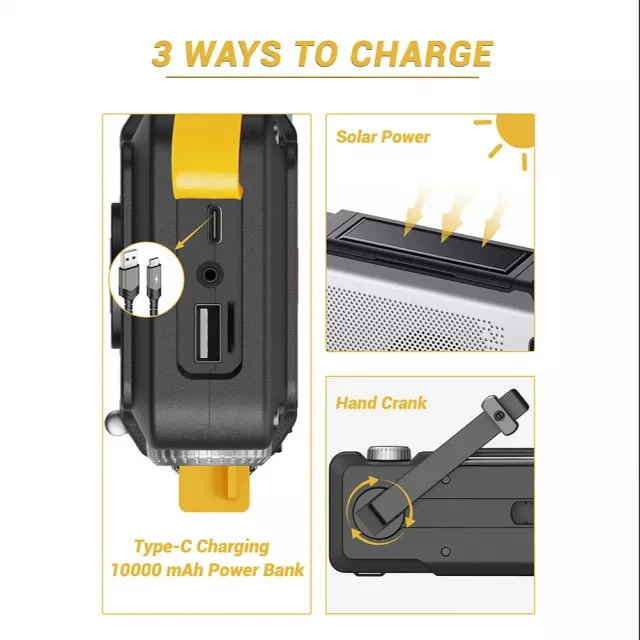 This portable weather radio picks up AM, FM, and WB channels, so you’ll always have access to the latest news, entertainment, and weather alerts. The extendable antenna provides enhanced reception, even in remote areas, so you won’t miss important broadcasts. Built for versatility, it offers three charging options — solar panel, hand crank, and Type-C charging — backed by a massive 10000mAh battery to keep your phone and other devices powered when it matters most.