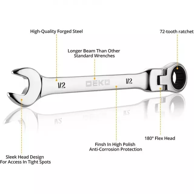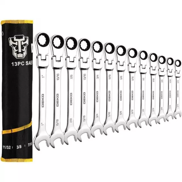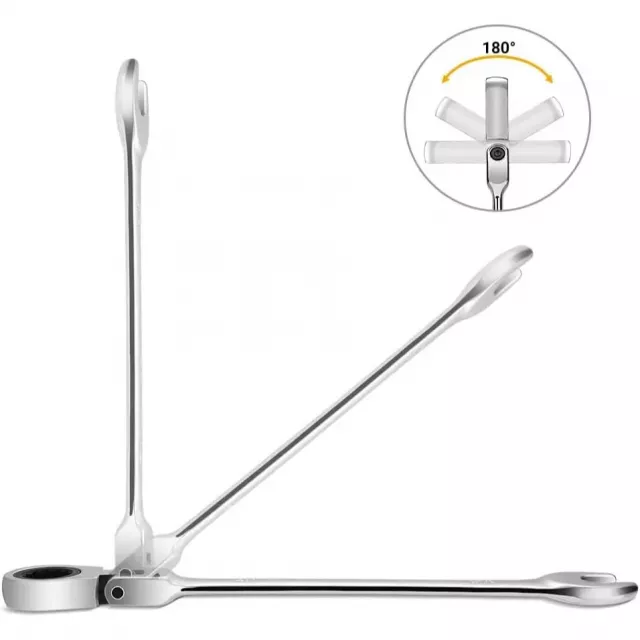 Take on any repair or maintenance task with confidence using this 13-piece Flex-Head Ratcheting Combination Wrench Set. Crafted from high-quality chrome vanadium steel and finished with a high-polish chrome, each wrench is designed to deliver superior strength and durability. The special water drop forging process and heat treatment make them tough enough for demanding jobs, while the corrosion-resistant plating keeps them looking and working like new for years.