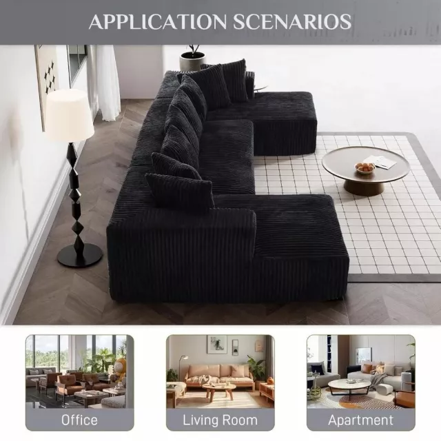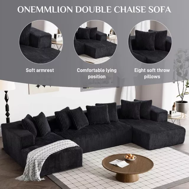 131″ Modular Black Corduroy Sectional Sofa with Chaise and 8 Pillows