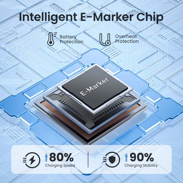 This cable features an upgraded E-Marker chip that automatically detects your device and delivers the precise current needed for fast charging. Once your device reaches full battery, the cable stops charging to prevent overcharging and protect your device’s battery life. It’s a smart solution for safe and reliable charging, giving you peace of mind every time you plug in.