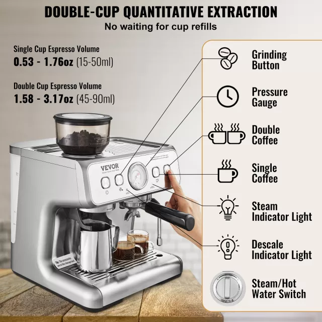 • 15 Bar High-Pressure Extraction: The 15-bar professional pressure system extracts rich and aromatic espresso, bringing out the perfect flavor and crema for each shot.