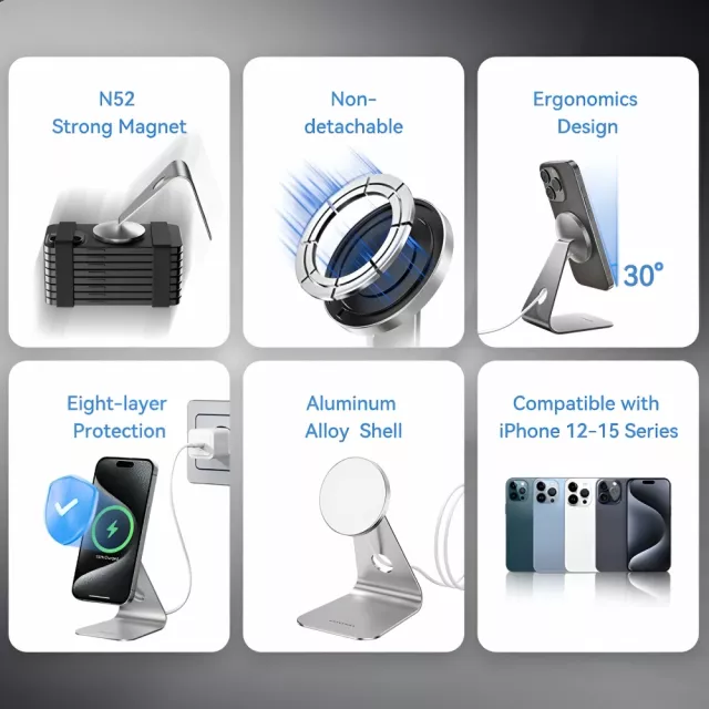 The charger’s ergonomic inclined angle design makes it perfect for work, streaming, or video calls. Its horizontal and vertical stand setup accommodates different usage scenarios. Crafted from durable aluminum alloy, it not only looks premium but also dissipates heat efficiently. Eight-layer protection keeps your device safe from overcharging, overheating, and short circuits.