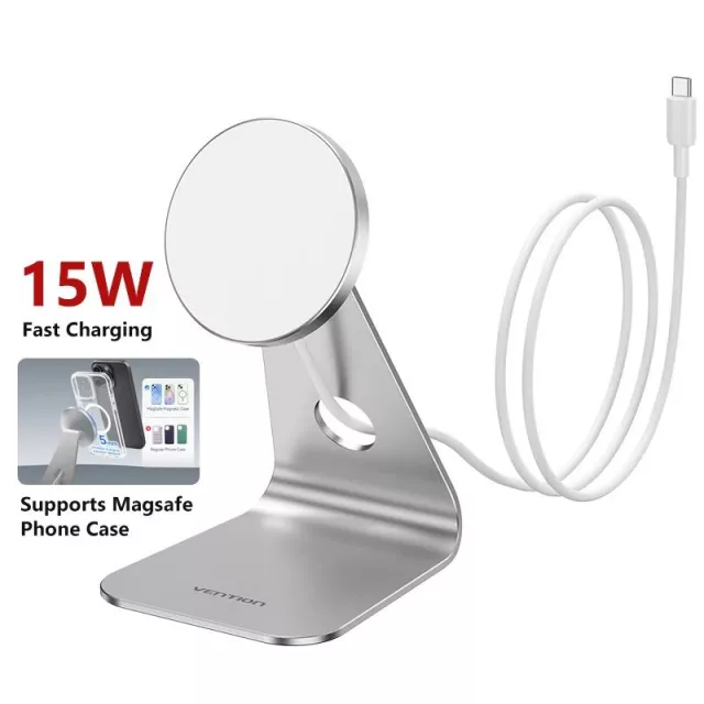 Upgrade your workspace with this sleek and powerful 15W magnetic wireless charging stand. Designed for iPhone 12, 13, 14, and 15 series, it provides fast and efficient charging right at your fingertips. Its compact design and aluminum alloy construction add a touch of elegance to any desk, while the inclined angle ensures comfortable viewing and interaction with your phone as it charges.