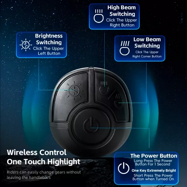 Stay in control without taking your hands off the handlebars. The included wireless remote control lets you adjust brightness levels or switch modes instantly. With multiple light settings—from high power to flashing modes—you can easily adapt to city streets, country roads, or rugged trails.