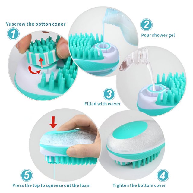 Use this pet bath brush during your regular grooming routine or whenever your pet needs a refreshing bath. Fill the foam reservoir with shampoo and water, then press to release foam onto your pet’s coat. Gently massage in circular motions using the soft silicone bristles to clean and relax your pet. Rinse thoroughly and repeat as needed. After use, simply rinse the brush and let it air dry for your next grooming session.