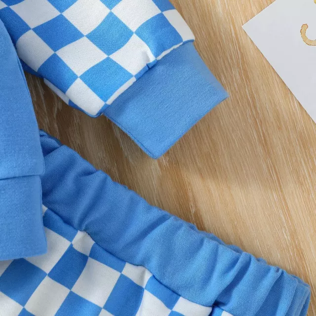 Dress your little one in comfort and charm with this 2-piece baby boy autumn outfit. Designed with a unique Chinese-style influence, this set includes a cozy long sleeve hooded sweatshirt in a calming blue tone and matching plaid pants for a complete look. The combination of soft jersey fabric with a touch of stretch makes it perfect for playful days and family outings during the crisp autumn months.