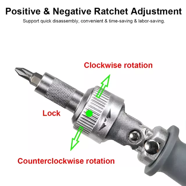 What truly sets our Multi-Angle Ratchet Screwdriver Set apart is its combination of quality materials and thoughtful design. The ergonomic handle features a non-slip grip, providing comfort and control while you work. The built-in fine ratcheting gear allows you to change the rotation direction easily, providing options to fix, tighten, or loosen screws without fuss. Plus, no harmful chemicals are involved in its construction, ensuring a safe and eco-friendly tool.