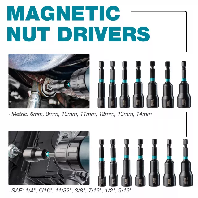 • 7 Metric and 7 SAE magnetic nut drivers for versatile usage