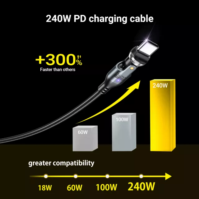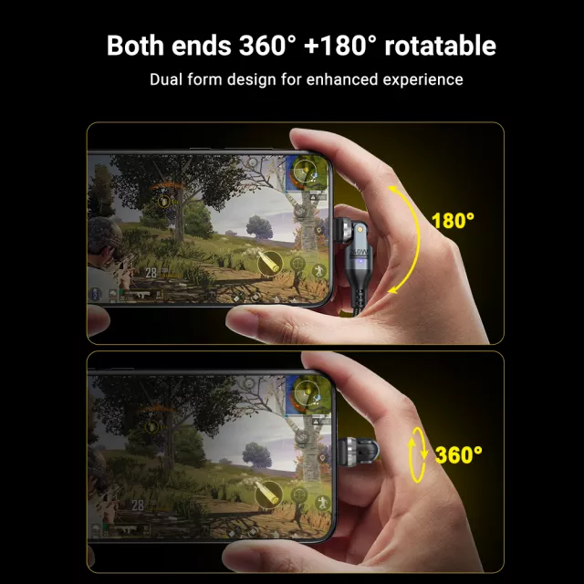 Built to last, the cable features a strong zinc alloy connector and a nylon braided exterior that resists tangling, bending, and everyday wear. The 540° rotating connectors prevent strain at the connection points, keeping your cable safe from damage and extending its lifespan. Its sleek black design adds a touch of elegance to your charging setup.