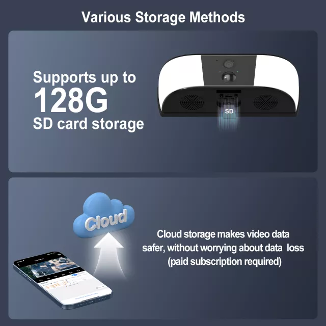 • Flexible Storage: Save recordings to an SD card or free cloud storage with upgrade options.