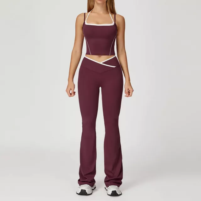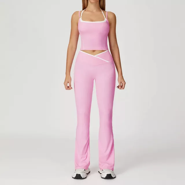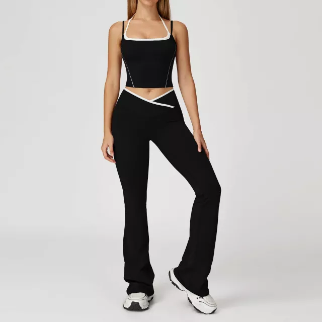 2Pcs Women Sports Pants Set with Push Up Yoga Top & High Waist Bell Bottoms
