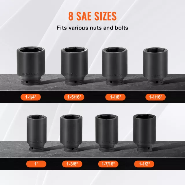 • Complete 8-Piece SAE Set: Includes 1″, 1-1/16″, 1-1/8″, 1-1/4″, 1-5/16″, 1-3/8″, 1-7/16″, and 1-1/2″ sockets, covering a wide range of vehicle applications.