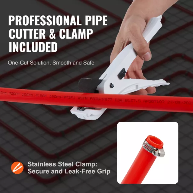 This PEX-B pipe is crafted from high-quality PE material with clear, upgraded markings to identify size, standards, and type at a glance. With a wide temperature tolerance from -40°F to 203°F, it adapts to extreme conditions without cracking or bursting. The included professional pipe cutter ensures clean, safe cuts every time, while stainless steel clamps provide a secure seal for fast, worry-free installations.
