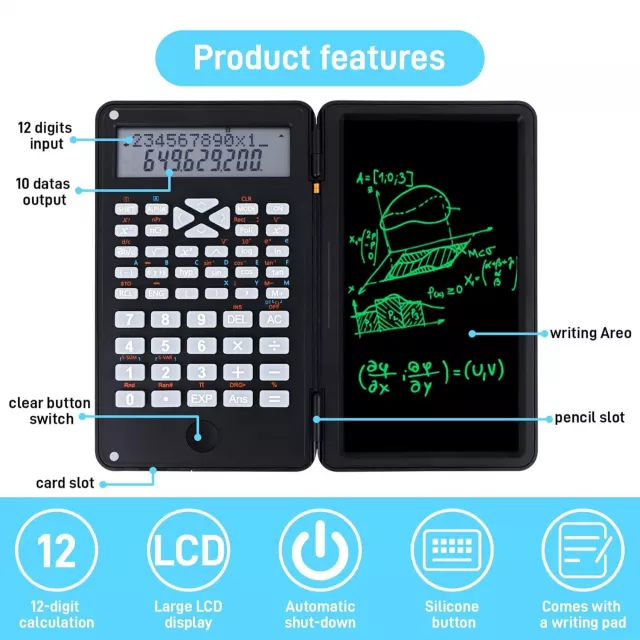 Perfect for students, engineers, nurses, teachers, and anyone who needs accurate and efficient calculations, this calculator covers math, science, and engineering tasks with ease. The foldable clamshell design keeps it protected in bags and pockets, making it ideal for school, office, or on-the-go problem-solving. Plus, the erasable notepad means you can make quick sketches, jot reminders, or check work without wasting paper.