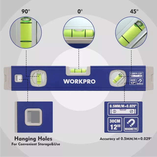 This spirit level set combines durability with smart functionality. Each level is equipped with clear and easy-to-read vials that measure 45°, 90°, and 180° angles. The set also includes a magnetic torpedo level, perfect for hands-free work on metal surfaces. Built with sturdy materials, these levels can handle tough environments while providing dependable precision. The variety of sizes ensures you always have the right tool, from quick checks to larger-scale projects.