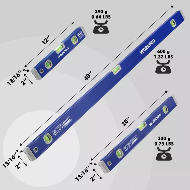 This set is ideal for woodworking, plumbing, home renovations, furniture assembly, and general construction. Use the compact 12″ level for small household tasks, the 20″ for mid-size projects, and the long 40″ level for extended surfaces like shelves or countertops. The torpedo level is especially useful when working in tight spaces or when you need magnetic support on pipes or metal beams.