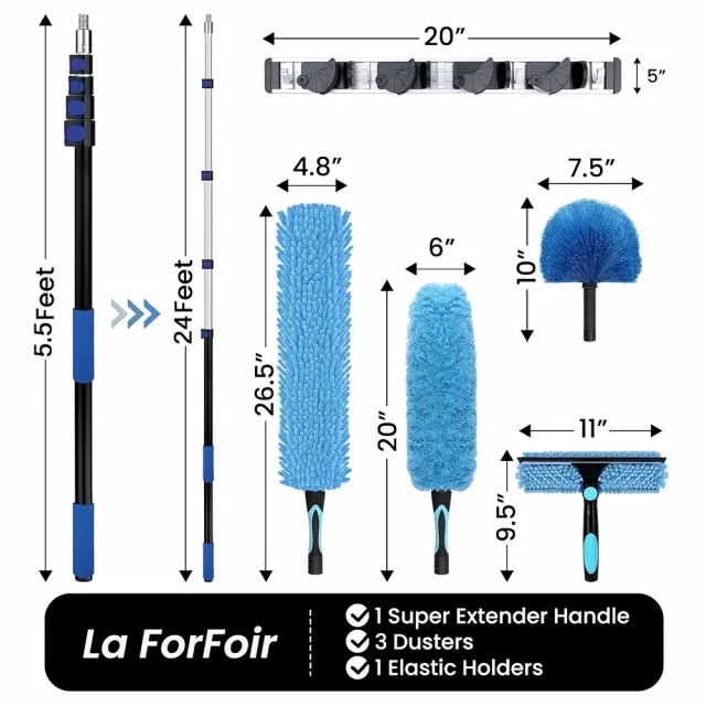 • Complete Cleaning Kit: Includes the telescoping pole, fan duster, cobweb duster, window squeegee, and wall rack organizer for easy storage.