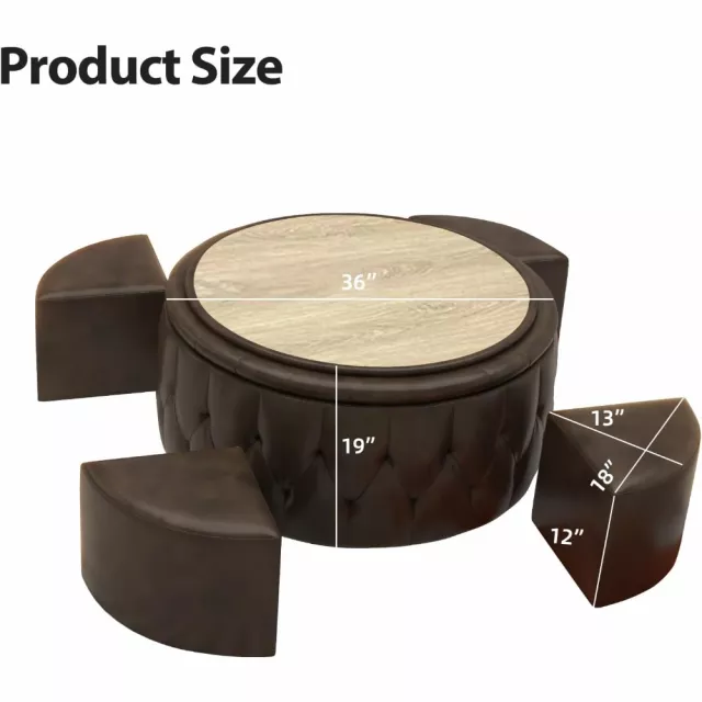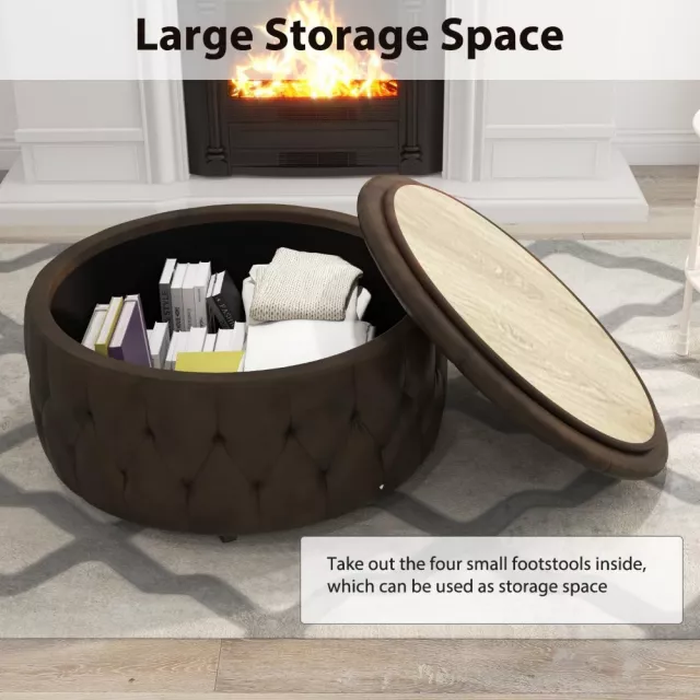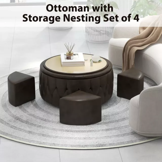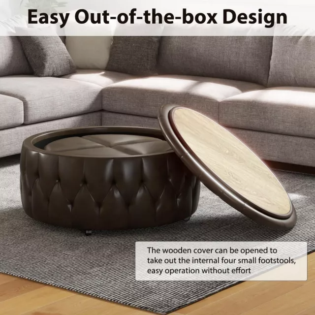 36″ Round Storage Ottoman with Wheels, Hidden Stools & Coffee Table Top