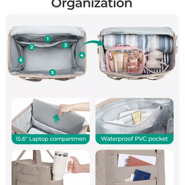Forget the hassle of digging through your bag. This tote is designed with 6 interior pockets and 5 exterior pockets for effortless organization. A padded 15.6″ laptop sleeve protects your tech, while the zippered PVC-lined waterproof pocket keeps toiletries or damp items separate. Whether it’s snacks, electronics, or travel documents, everything has its place and stays easy to find.
