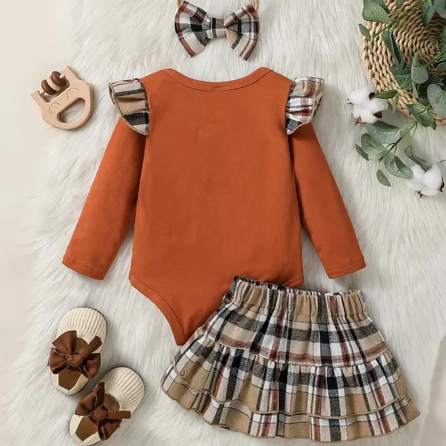 Dress your baby girl in timeless elegance with this adorable 3-piece autumn outfit. Featuring a soft, solid-colored bodysuit, a classic plaid skirt, and a matching bow, this set blends comfort with charming preppy style. Designed for babies from newborn up to 18 months, it’s the perfect choice for family gatherings, photoshoots, and cozy autumn days. The combination of high-quality cotton, polyester, and a touch of spandex ensures a gentle, stretchy fit that moves with your little one while keeping her snug and stylish.