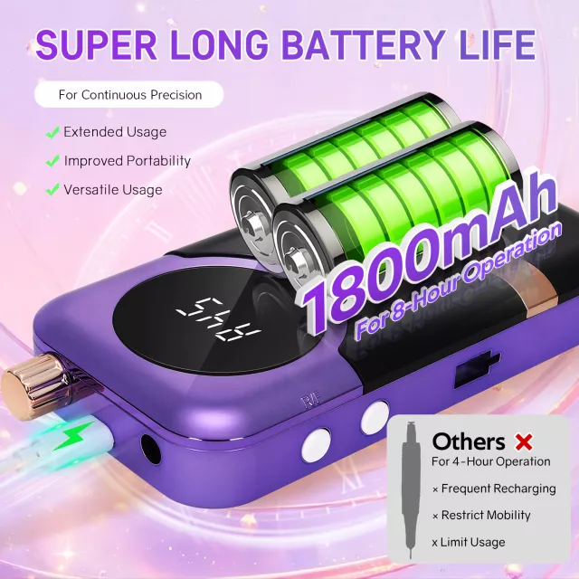 Say goodbye to messy cords. This rechargeable electric nail file features a powerful 1800mAh battery that offers up to 8 hours of use on just a 2-hour charge. The clear LCD screen keeps you in control by displaying speed, rotation direction, and battery level, ensuring precise and worry-free nail care every time.