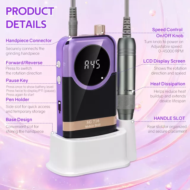 Designed with portability in mind, this nail drill is lightweight and easy to carry. Its compact size makes it perfect for travel, while the convenient belt clip allows for hands-free control. Whether you’re working in a salon or doing nails at home, you can enjoy professional-quality results anywhere.