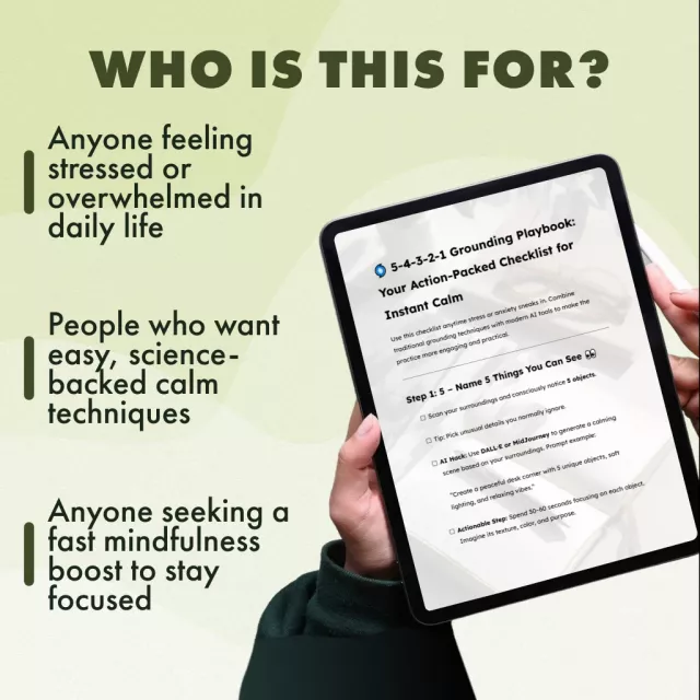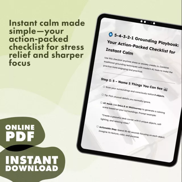 Unlike generic mindfulness resources, the 5-4-3-2-1 Grounding Playbook blends the proven 5-senses grounding method with modern AI-powered enhancements. This makes it not only practical and easy to use, but also fun, interactive, and customizable to your environment. It’s designed for busy professionals, students, parents, or anyone seeking fast, effective relief without complicated practices.
