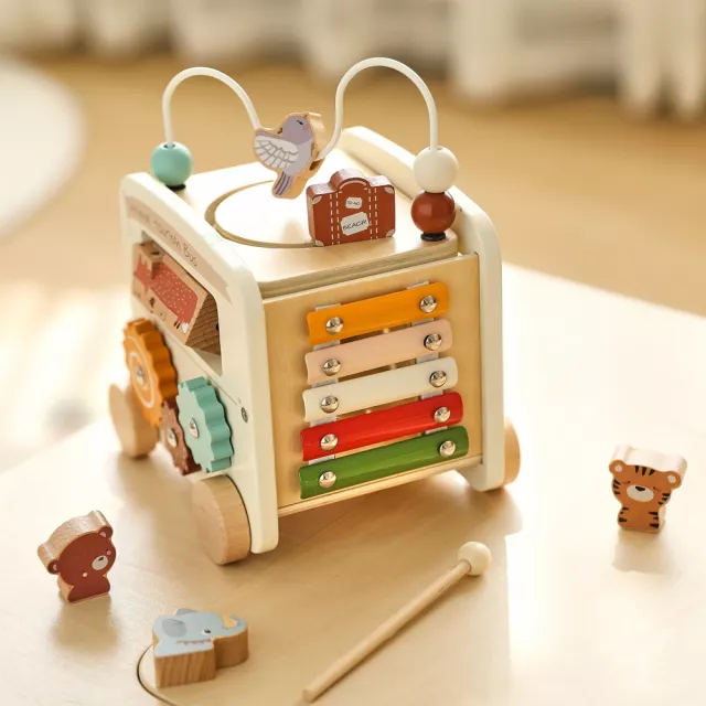 This wooden activity bus is thoughtfully crafted with safe, non-toxic materials, ensuring hours of worry-free play. Featuring bright colors and playful themes such as transportation, sports, and occupations, it keeps little hands and minds busy. Measuring just the right size for toddlers, it includes wooden building blocks, shape puzzles, and busy activity stations that help with motor skills and cognitive growth. With no harmful chemicals and smooth rounded edges, it’s perfect for children ages 18 months and up.