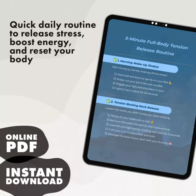 Feeling stressed, stiff, or drained during the day? The 5-Minute Full-Body Tension Release Routine is your go-to digital checklist designed to help you reset, refresh, and recharge in just minutes. Perfect for busy mornings, mid-day slumps, or evening wind-downs, this easy-to-follow guide gives you a practical, step-by-step system to release tension from head to toe. Whether you’re working at a desk, juggling daily tasks, or simply need a quick wellness boost, this routine is your pocket-sized path to instant relief and renewed energy.