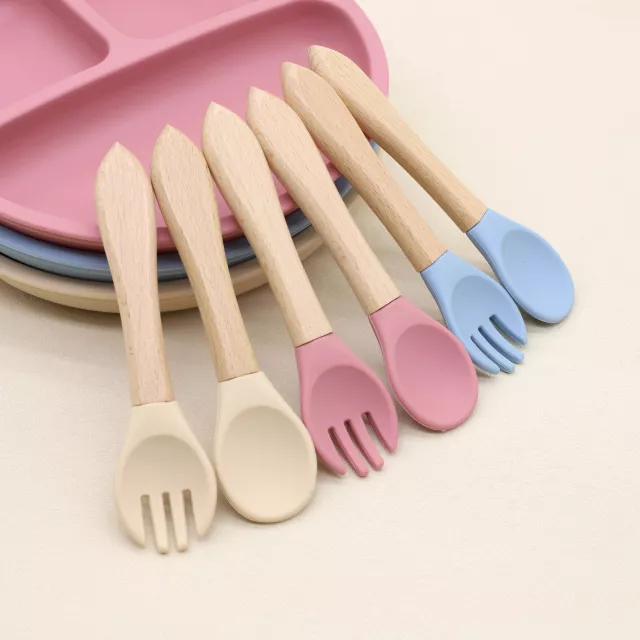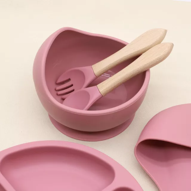 5-Piece Baby Silicone Tableware Set with Suction Cup and Wooden Utensils