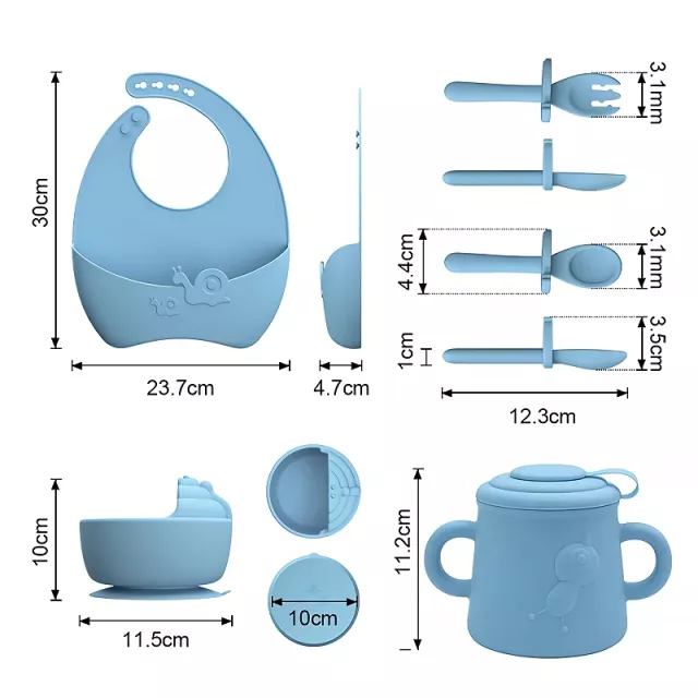 This set comes complete with a suction bowl, a baby-friendly spoon, a fork, a snack cup, and an adjustable bib. Each piece is crafted from soft yet sturdy silicone, making them comfortable to use and easy to clean. The strong suction base on the bowl helps prevent spills, while the snack cup’s flexible lid keeps food secure and accessible. The adjustable bib catches crumbs before they hit the floor, making cleanup a breeze.