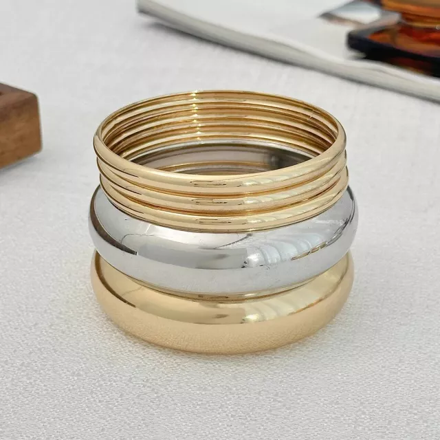 Bring effortless style and a touch of attitude to your look with this 5-piece set of punk minimalist geometric gold bangles. Designed for both women and men, these smooth, round cuff bracelets combine clean lines with a bold edge, making them the perfect statement for any occasion. Whether you want to add a rebellious twist to a casual outfit or bring subtle sophistication to an evening look, these bangles deliver versatility and charm in one sleek package.