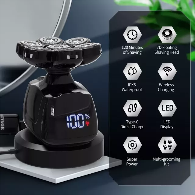 This electric shaver combines advanced technology with comfort. The 7D floating rotary blades adapt to the curves of your head and face, delivering a clean, irritation-free shave every time. Whether you prefer a dry shave or a refreshing wet shave in the shower, this waterproof design makes it possible. The ergonomic grip ensures control, while the powerful rechargeable battery gives you up to 120 minutes of cordless use on just a 1-hour charge.