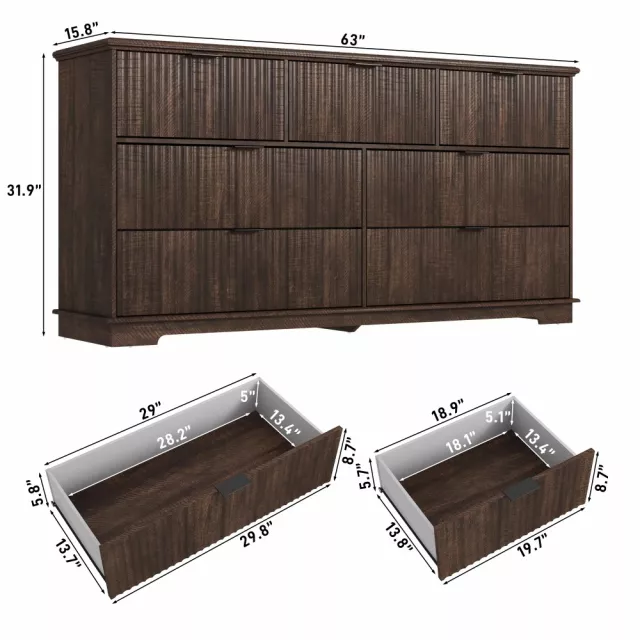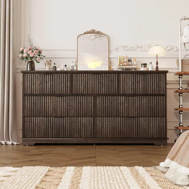 Crafted with durable engineered wood, this dresser stands strong and stable. The fluted texture adds depth and character, while the neutral brown color palette easily blends with your decor. Its spacious surface is ideal for displaying your favorite framed photos, plants, or home accessories, while the seven generously sized drawers provide plenty of room to store clothing, linens, and more.