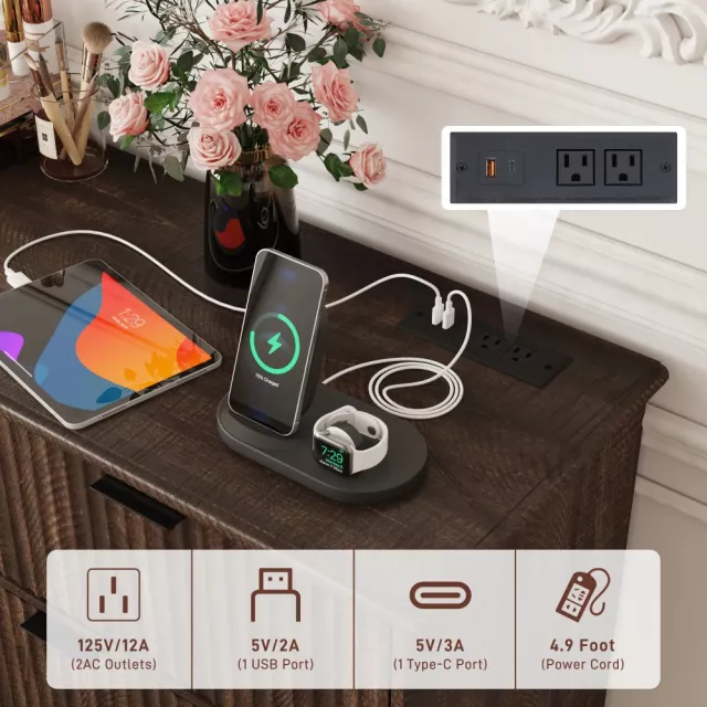 • Smart Charging: Includes 2 AC outlets, 2 USB ports, and 1 Type-C charging port built into the dresser.