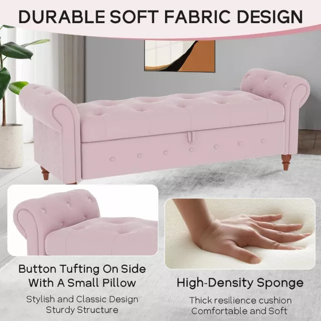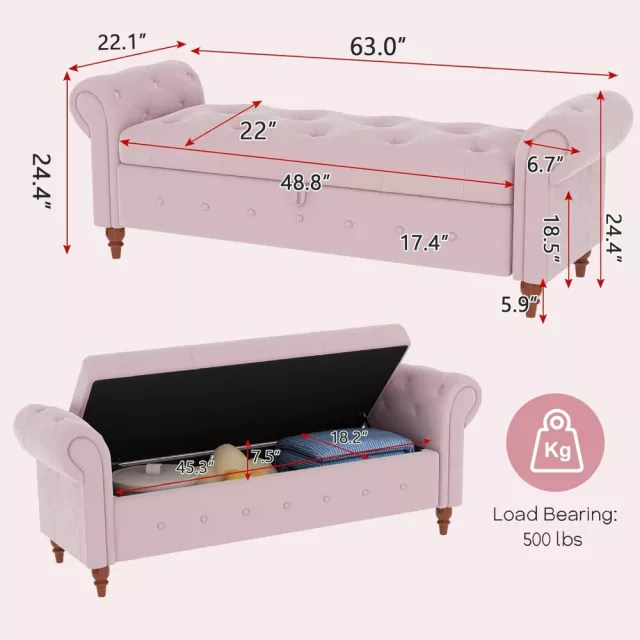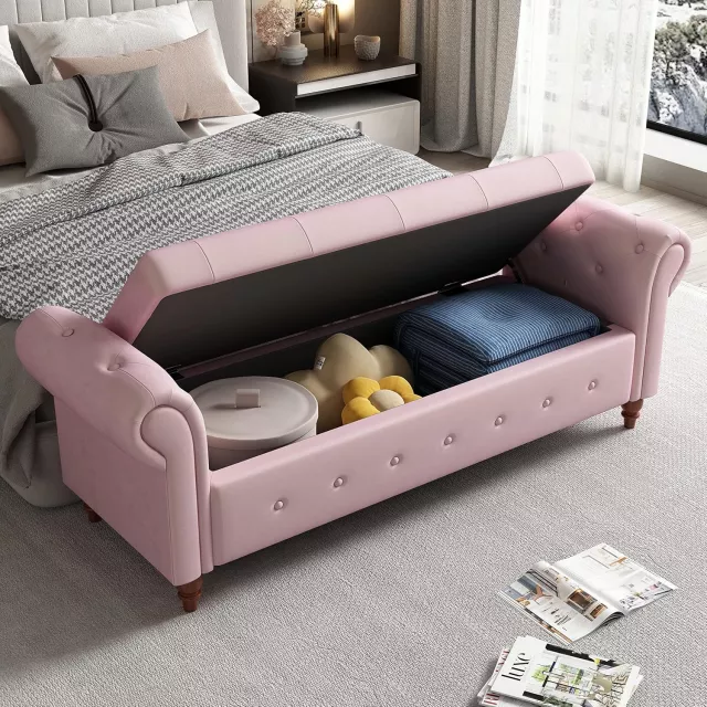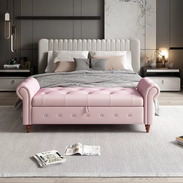 Elevate your space with this luxurious 63-inch tufted storage ottoman bench — a versatile piece designed to blend beauty, comfort, and function in any room. Crafted with care and style, this elegant bench features a button-tufted seat, rolled arms, and soft, breathable upholstery that brings a classic charm to your bedroom, living room, hallway, or nursery. Whether you need a cozy seat, a stylish storage solution, or an accent piece, this ottoman bench delivers it all with effortless grace.