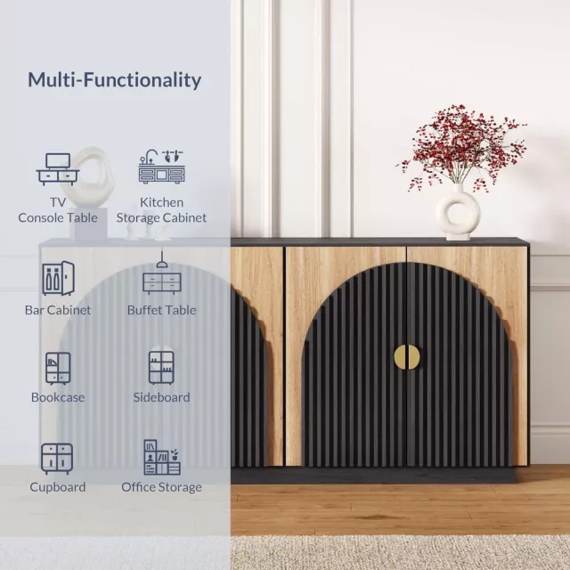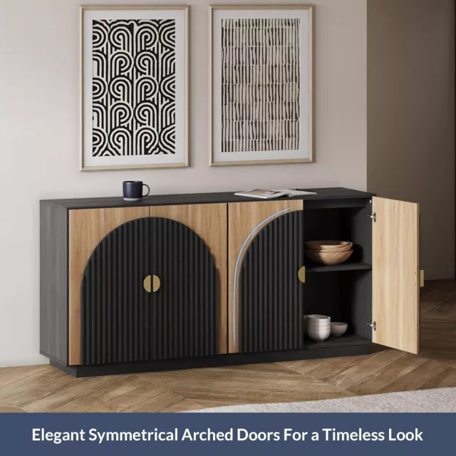 Its fluted door fronts add a unique texture that catches the eye, while the arched design offers a subtle yet sophisticated architectural touch. Inside, adjustable shelves give you the freedom to store everything from fine china to everyday essentials, keeping your space neat and organized. With its wide 65-inch top, there’s plenty of surface space for decorative pieces, serving trays, or even a coffee station setup.
