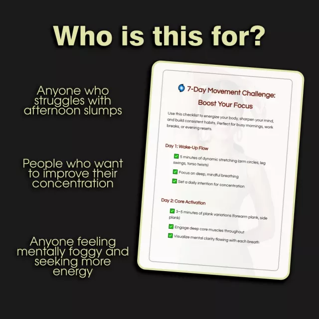 This digital checklist is perfect for busy professionals, students, remote workers, entrepreneurs, and anyone who struggles with distraction. If you want to improve your concentration without a major time commitment, this structured, gentle 7-day movement challenge to improve focus is your ideal starting point. It requires no special equipment and fits into even the most packed schedule.