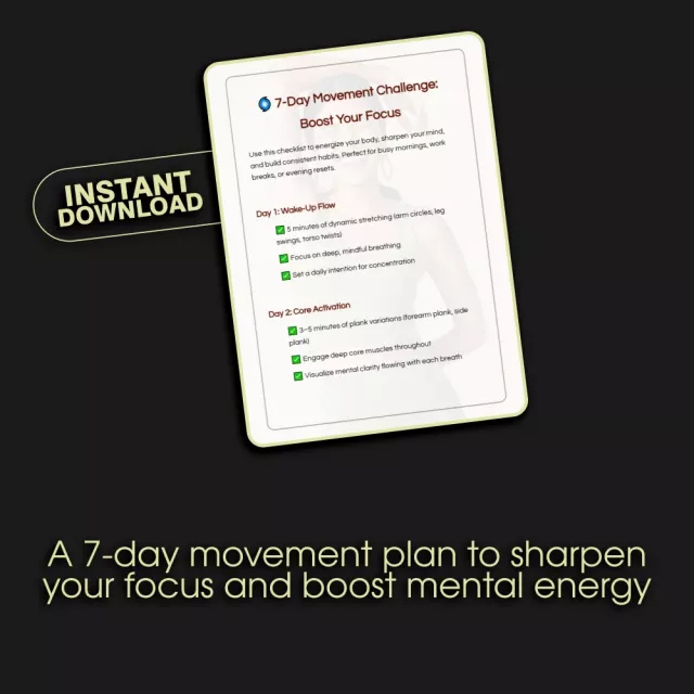 Stop letting a scattered mind hold you back. This 7-day movement challenge to improve focus is a simple, effective, and immediate way to take control of your cognitive performance. The digital checklist format means you can download it right now and start your journey to a sharper, more focused you within minutes.