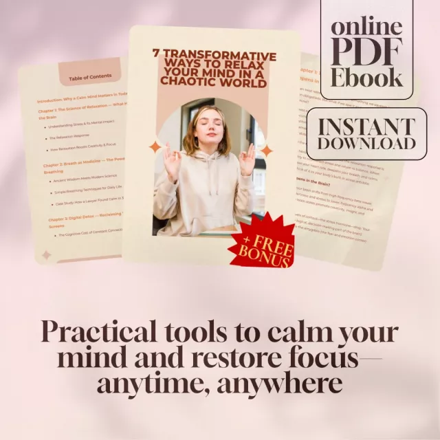 In a world that never slows down, finding inner peace feels more important—and more elusive—than ever. 7 Transformative Ways to Relax Your Mind in a Chaotic World is your digital sanctuary, a beautifully designed eBook crafted to help you understand, access, and sustain true mental relaxation. Whether you’re overwhelmed by daily stress, tethered to your devices, or simply looking to feel more grounded, this downloadable guide gives you practical, science-backed tools to quiet your mind and reclaim clarity—right from your phone, tablet, or computer.