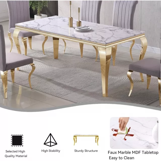 This 70″ dining table stands out for its luxurious faux marble finish, which offers the sophisticated look of marble without the hefty price tag. The gold S-shaped stainless steel base adds a modern twist, bringing a sense of refined luxury to your home. Whether you’re hosting an intimate dinner for friends or a large family meal, this table’s spacious surface ensures everyone has a comfortable place to sit. It is crafted with both style and durability in mind, combining elegant design with sturdy construction for long-lasting use.