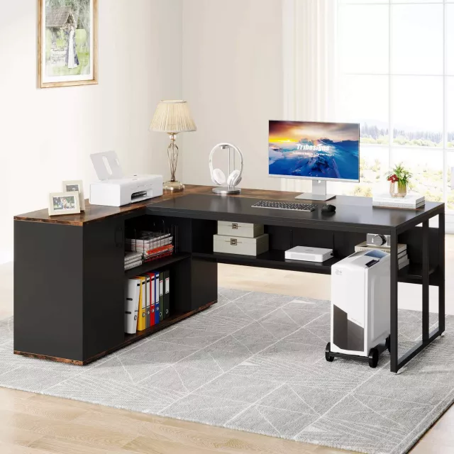 The expansive L-shaped design gives you a wide 71-inch surface for dual monitors, laptops, and documents, while the smart storage solutions keep everything organized. Featuring a full-length cabinet, multiple shelves, and dedicated space for office machines like printers and CPUs, this desk helps keep your work area clutter-free and your essentials always within arm’s reach.
