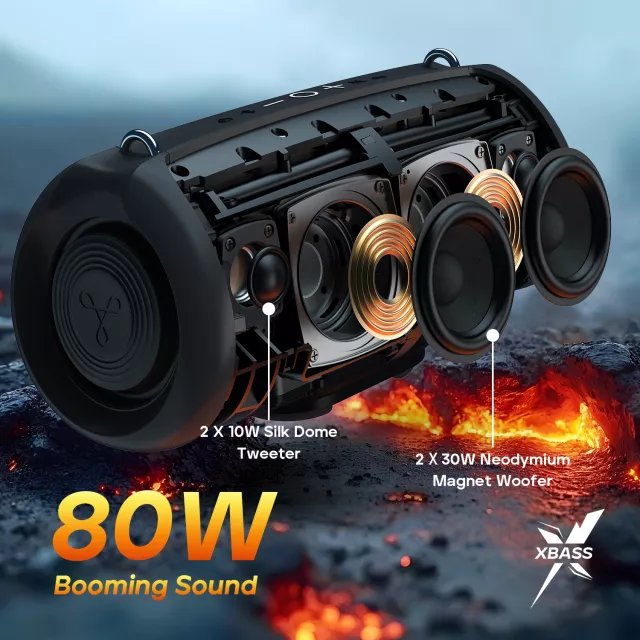 • 80W Booming Sound: Equipped with dual 30W neodymium magnet drivers and dual 10W tweeters, this speaker brings a thunderous audio experience that will keep you pumped up and moving.