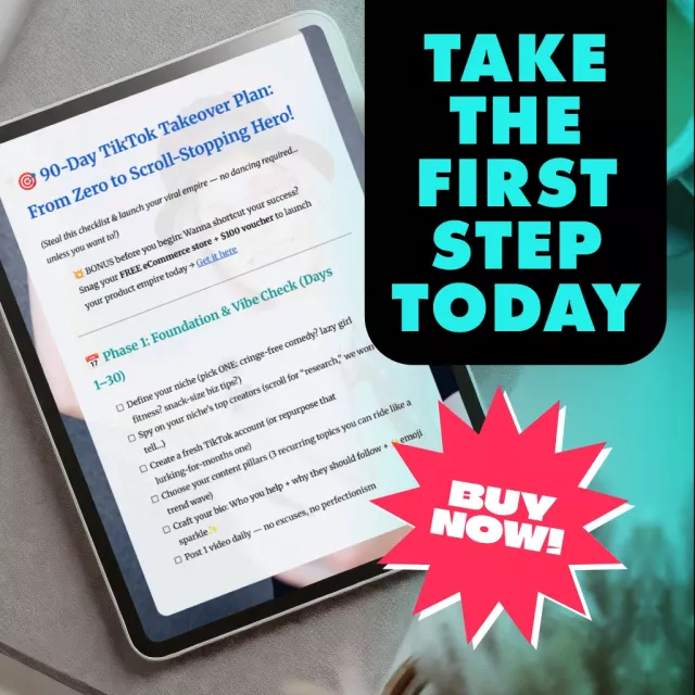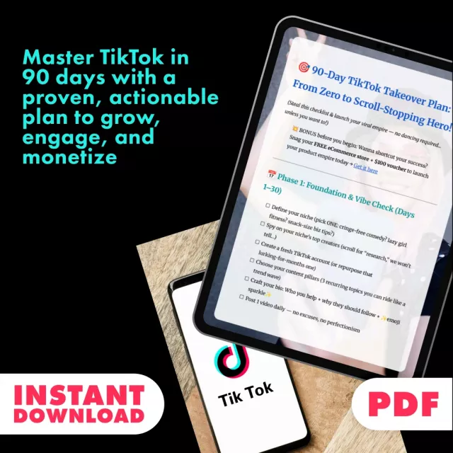 Get started now with the 90-Day TikTok Takeover Plan: From Zero to Scroll-Stopping Hero! No more confusion or procrastination. With clear steps and expert tips, you’ll be well on your way to TikTok success in just 90 days. Download now and start your journey to becoming a TikTok sensation!