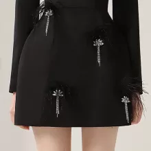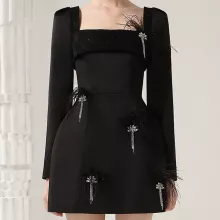 This little black dress takes elegance to a new level with its luxurious details and versatile design. The feather accents and intricate beading create an unforgettable visual effect, while the lace adds a timeless, romantic touch. Perfect for autumn events, this dress combines practicality with high-end style, making it ideal for formal gatherings, holiday parties, or evenings where you want to feel extraordinary.