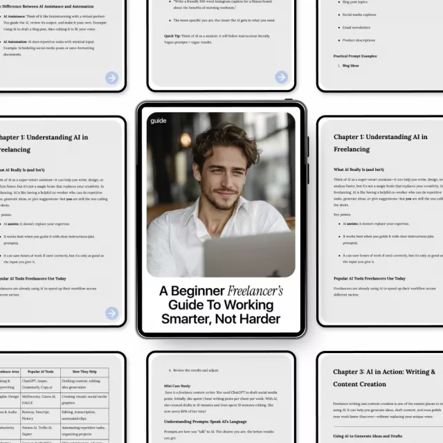 If you’re ready to spend less time on repetitive tasks and more time growing your freelance business, A Beginner Freelancer’s Guide to Working Smarter, Not Harder is your next step. Download the ebook today and start building a smarter, more sustainable freelance workflow powered by AI.