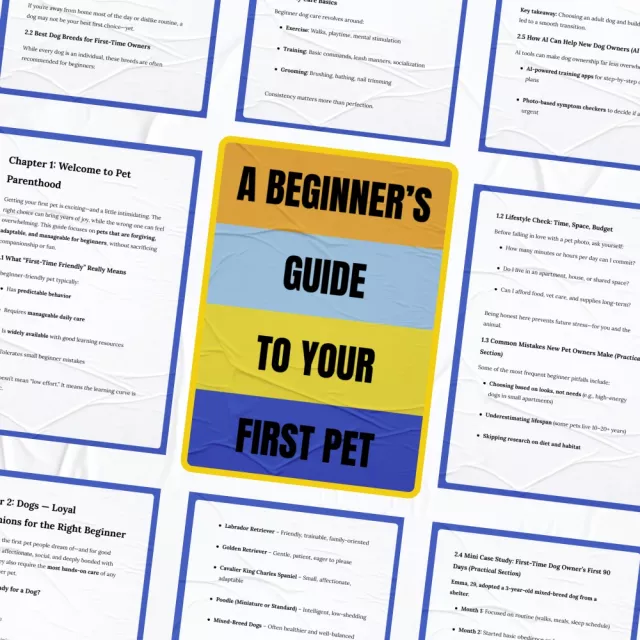 Unlike generic pet ebooks, this guide focuses specifically on pets that are good for first time owners. It combines practical advice, lifestyle matching, and real-world examples—plus a unique section on how AI tools can support new dog owners. The tone is supportive, realistic, and beginner-focused, not overwhelming.