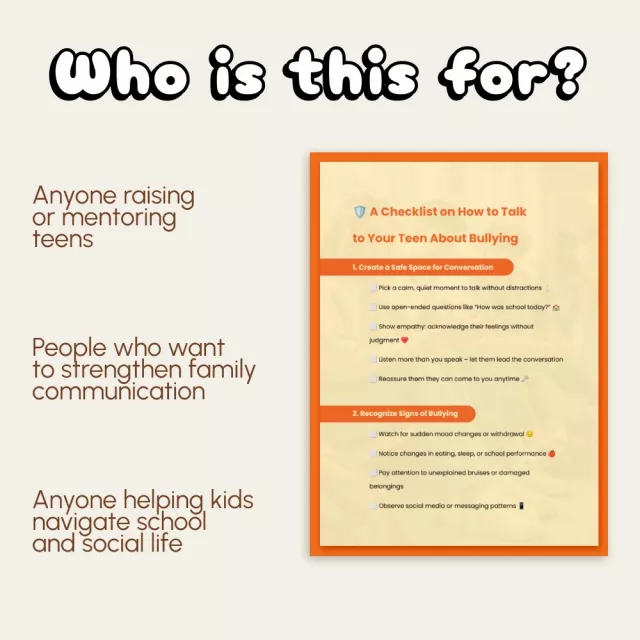 Unlike long eBooks or generic parenting articles, A Checklist on How to Talk to Your Teen About Bullying offers a concise, actionable format. It’s thoughtfully designed for today’s digital world, blending emotional intelligence with technology-friendly strategies to help families thrive in online and offline environments.