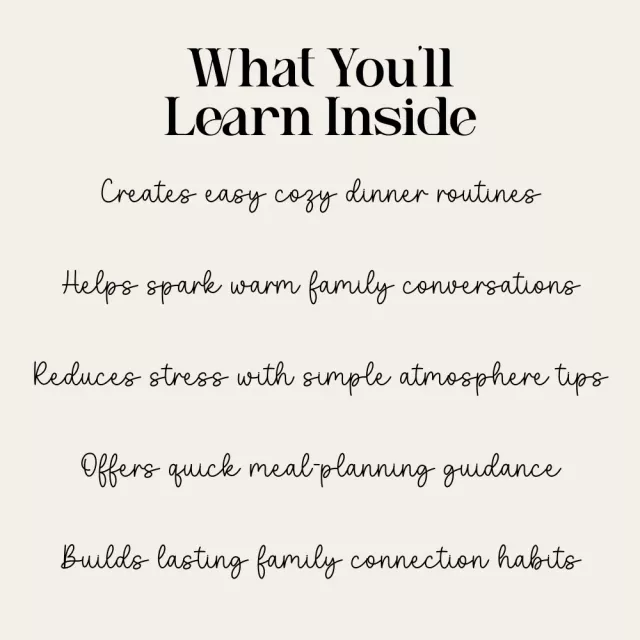 Unlike generic meal-planning PDFs, this blueprint goes far beyond food. It blends atmosphere, emotion, conversation, routines, and practical systems into one warm, accessible resource. You’ll find real-life case studies, AI-powered conversation tips, and step-by-step guidance that makes cozy dinners doable even on your busiest nights.